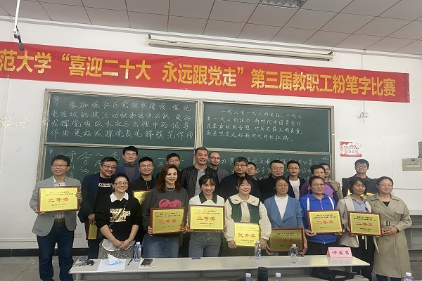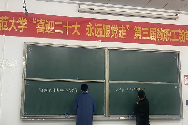 本网讯(通讯员 柯康敏)为庆祝党的二十大胜利召开,进一步推动校园文化建设,提高教师教学基本功,展示教师良好职业素养,10月20日下午,湖北师范大学举办了“喜迎二十大 永远跟党走”第三届教职工粉笔字比赛,来自各分工会共18位选手参加角逐。BD半岛bandao·(中国区)官方网站学工部王磊老师代表BD半岛bandao·(中国区)官方网站参加了此次比赛,荣获优秀奖。