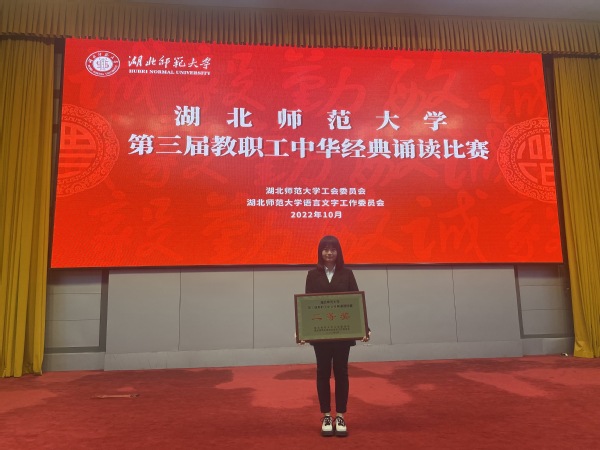 本网讯(通讯员 柯康敏)10月27日下午,湖北师范大学第三届教职工中华经典诵读在教育大楼学术报告厅举行,BD半岛bandao·(中国区)官方网站人文学部丁书嫚老师朗诵的作品《读中国》荣获二等奖。