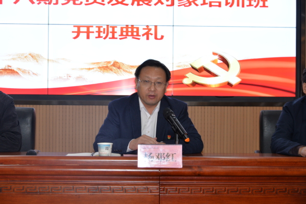 党委书记杨邓红作了动员讲话,要求全体学员,一是要提高认识、高度重视,深刻领会举办本次培训班的重要意义;二是要不忘初心、牢记使命,坚定共产主义理想信念;三是要学以致用、知行合一,争做担当有为的时代先锋;四是要严格要求,遵守纪律,圆满完成培训任务。他指出,新时代中国青年生逢盛世,大有可为,也必将大有作为。他希望大家能够“用脚步丈量祖国大地,用眼睛发现中国精神,用耳朵倾听人民呼声,用内心感应时代脉搏”,接过历史的接力棒,书写无愧于这个伟大时代的青春之歌。