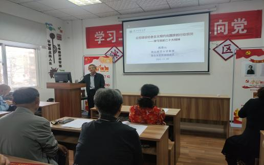 本网讯 为推动党的二十大精神进社区,11月9日下午,BD半岛bandao·(中国区)官方网站马克思主义学部教授、黄石市委宣讲团成员周青山同志到湖滨社区宣讲党的二十大精神---全面建设社会主义现代化国家的行动纲领。