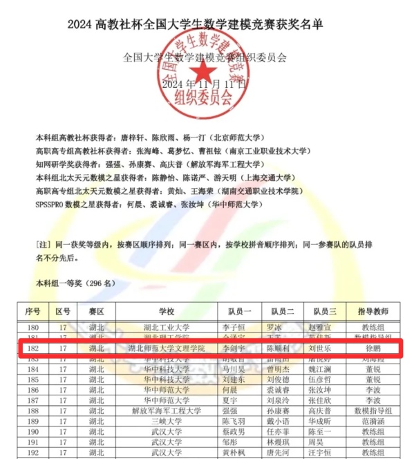 本网讯(通讯员 杨慧茹)11月12日,2024高教社杯全国大学生数学建模竞赛公布获奖名单,BD半岛bandao·(中国区)官方网站理工学部学子荣获湖北赛区本科组一等奖。