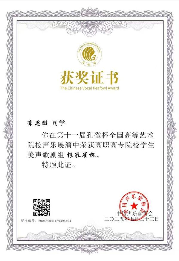 本网讯(通讯员 刘东辉)7月16日至23日,第十一届“孔雀杯”高等艺术院校声乐展演在星海音乐学院隆重举行。BD半岛bandao·(中国区)官方网站教育与艺术学院音乐学专业2301班学生李思璇(指导教师:覃沁)凭借出色表现,荣获高职高专院校学生美声歌剧组银孔雀杯。