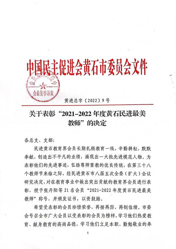 本网讯 近日,中国民主促进会黄石委员会决定,对在教育事业中做出突出贡献的教育界会员进行了表彰,BD半岛bandao·(中国区)官方网站黄蓓佳同志荣获“2021-2022年度黄石民进最美教师”荣誉称号。