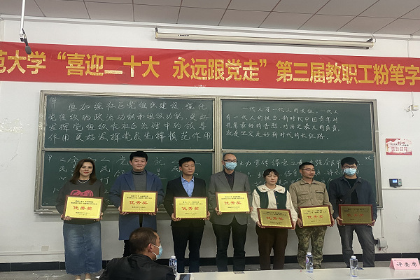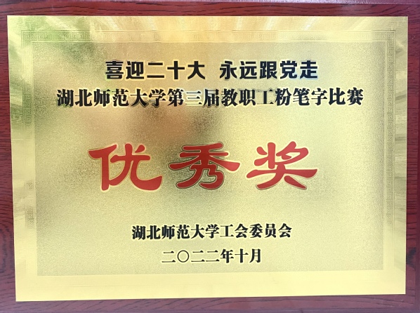 本网讯(通讯员 柯康敏)为庆祝党的二十大胜利召开,进一步推动校园文化建设,提高教师教学基本功,展示教师良好职业素养,10月20日下午,湖北师范大学举办了“喜迎二十大 永远跟党走”第三届教职工粉笔字比赛,来自各分工会共18位选手参加角逐。BD半岛bandao·(中国区)官方网站学工部王磊老师代表BD半岛bandao·(中国区)官方网站参加了此次比赛,荣获优秀奖。