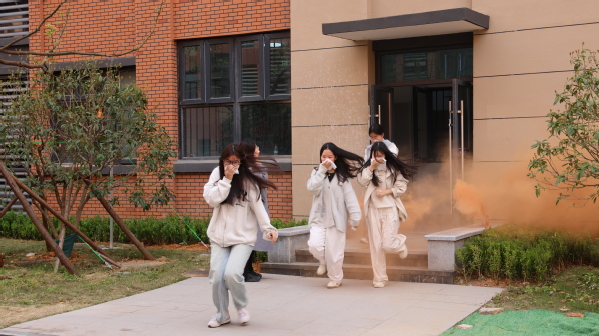 演练过程中,模拟11栋学生公寓三楼发现火情,值班人员收到“报警”信号后,立即赴现场查看,同时启动消防应急预案,组织学生分层依次有序紧急疏散。在各楼层引导员指引下,同学们用湿巾捂住口鼻,低姿快速地通过浓烟区,靠右弯腰撤离,迅速转移到安全区域。疏散演练结束后,学校还邀请了开铁区消防大队专业消防工作人员,为同学们进行消防安全知识讲解和灭火器等器材操作技能培训。