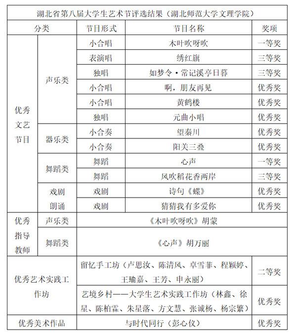 本网讯 5月6日,湖北省教育厅公布关于湖北省第八届大学生艺术节优秀组织奖和“三优一案例”评选结果的通知。BD半岛bandao·(中国区)官方网站教育与艺术学部荣获17个奖项,其中一等奖2项,二等奖1项,三等奖3项,优秀奖9项。胡蒙、胡万丽获指导教师奖。