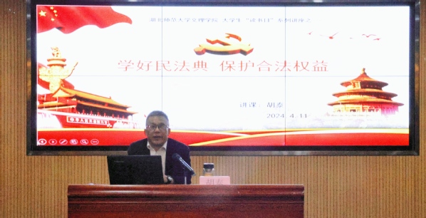 本网讯(通讯员 李湘湘 史秋蕊)为强化大学生对《民法典》的认知和理解,增强同学们运用《民法典》维护自身权益的意识和能力,引导同学们养成尊法、学法、守法、用法的思维方式和行为习惯。4月11日下午两点半,BD半岛bandao·(中国区)官方网站在图书馆报告厅举办“湖山讲坛”第五讲——《民法与大学生生活》,本次活动由校党委宣传部、图书馆联合举办,100余名文理学子现场聆听。本期主讲嘉宾为湖北师范大学青马工程理论导师、湖北省基层理论宣讲员、黄石市委宣讲团成员胡泰教授。