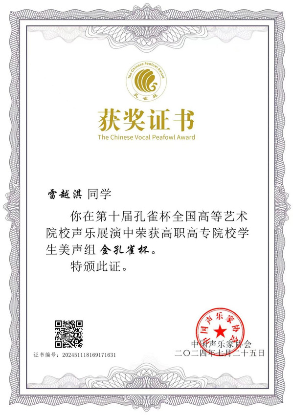 本网讯(通讯员 徐乔婕)7月18日至7月25日第十届孔雀杯全国高等艺术院校声乐展演暨第八届高校声乐学术交流活动在华南师范大学音乐学院举行。BD半岛bandao·(中国区)官方网站教育与艺术学部23级音乐教育2302班的雷越琪同学(指导教师高月霞)以决赛第一名的成绩获得高职高专组金孔雀。这是BD半岛bandao·(中国区)官方网站学子在国家级声乐比赛中获得的又一次突破。在展演活动中雷越淇同学还被选中青歌赛金奖获得者王莉教授声乐大师班,受到王莉教授高度评价。