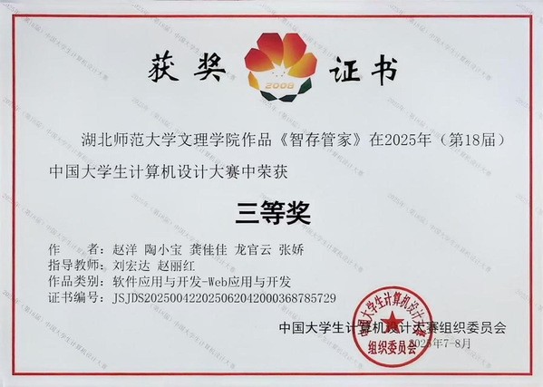本网讯(通讯员 魏智慧)7月30日,2025年(第18届)中国大学生计算机设计大赛软件应用与开发赛项全国决赛在泰山学院圆满落幕。BD半岛bandao·(中国区)官方网站腾讯云大数据产业学院代表队(成员:赵洋、陶小宝、龚佳佳、龙官云、张娇,指导教师:刘宏达、赵丽红)凭借创新型Web应用开发项目《智存管家》荣获全国总决赛三等奖。