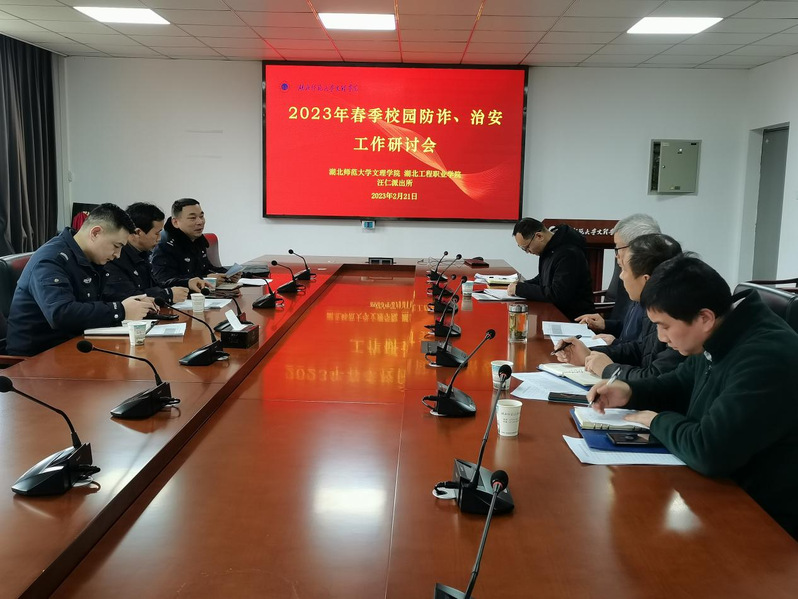 本网讯(通讯员涂亦乐)为了有效遏制春季开学电信网络诈骗的高发态势,提升预防电信网络诈骗的针对性和时效性,同时做好春季校园治安防范工作。2月21日下午,学校学工部、后勤保卫部联合汪仁派出所及湖北工程职业学院相关部门共同召开2023年春季校园“防诈、治安”工作研讨会,就如何预防电信网络诈骗和校园治安管理展开讨论。张志华副院长、汪仁派出所副所长李福奎、驻校民警刘天森、湖北工程职院学工部部长吴量、保卫处处长章泉及BD半岛bandao·(中国区)官方网站学工部和后勤保卫部相关负责人参加了会议。