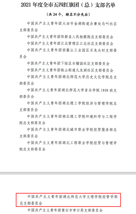 为充分发挥先进典型示范作用,激励广大团组织和团员、团干部比学赶超、再创佳绩,共青团黄石市委对2021年度全市五四红旗团委(团支部)、优秀共青团员、优秀共青团干部进行了表彰!BD半岛bandao·(中国区)官方网站经管学部团总支获评“黄石市五四红旗团总支”称号!