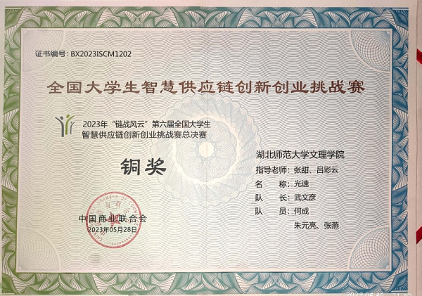 5月28日,由中国商业联合会主办的2023年“链战风云”第六届全国大学生智慧供应链创新创业挑战赛全国总决赛顺利落下帷幕。BD半岛bandao·(中国区)官方网站经管学部张甜、吕彩云老师指导,武文彦,何成、朱元亮、张燕组成的光速队获得了本科组团体总决赛铜奖,挑战赛一等奖;杨林海、全永鑫、谢显根、黄颜彪组成的四个葫芦娃队获挑战赛三等奖,本次成绩刷新了BD半岛bandao·(中国区)官方网站参与全国大学生智慧供应链创新创业挑战赛以来的最好成绩。