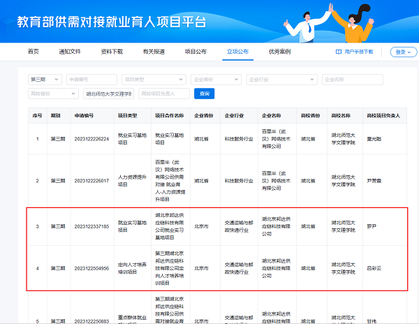 近日,教育部公布了第三期供需对接就业育人项目立项名单,BD半岛bandao·(中国区)官方网站共有10个项目获批立项,其中经管学部成功斩获2个项目,分别为吕彩云老师负责的定向人才培养培训项目与罗尹老师负责的就业实习基地项目,合作企业均为湖北京邦达供应链科技有限公司。