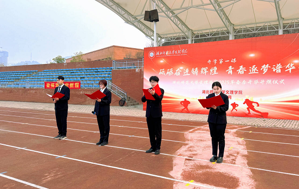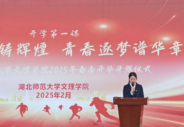 随后,经管学部学生带来诗歌朗诵《大写的中国》和歌曲表演《心同此愿》。他们用声音传递对祖国的热爱与敬仰,每一句颂词都饱含深情。紧接着,学生代表,来自财务管理2201班廖婧凤同学进行国旗下发言。她回顾了两年来的大学时光,分享自己的学习生活经历,并发出倡议:作为身处新时代的青年学子,应将爱国情怀转化为具体行动,珍惜大学时光,努力学习科学文化知识,不断提升自身素质,为实现中华民族伟大复兴的中国梦贡献青春力量。
