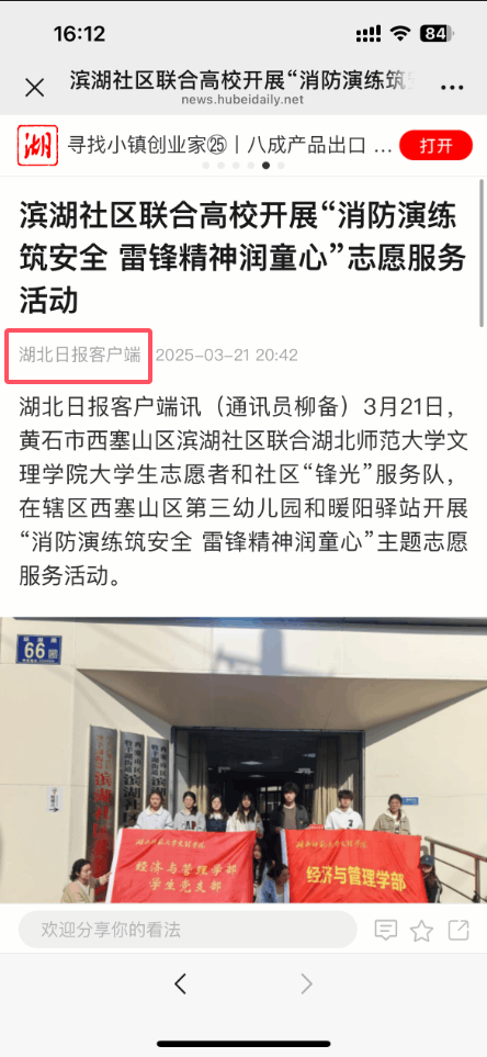 此次活动不仅增强了孩子们的消防安全意识,也让雷锋精神在志愿服务中得到传承与弘扬。同时,活动获云上黄石、湖北日报客户端报道,彰显了社会各界对校社合作的认可与支持。未来,经济与管理学部将继续深化校社共建,整合多方资源,打造更完善的志愿服务体系