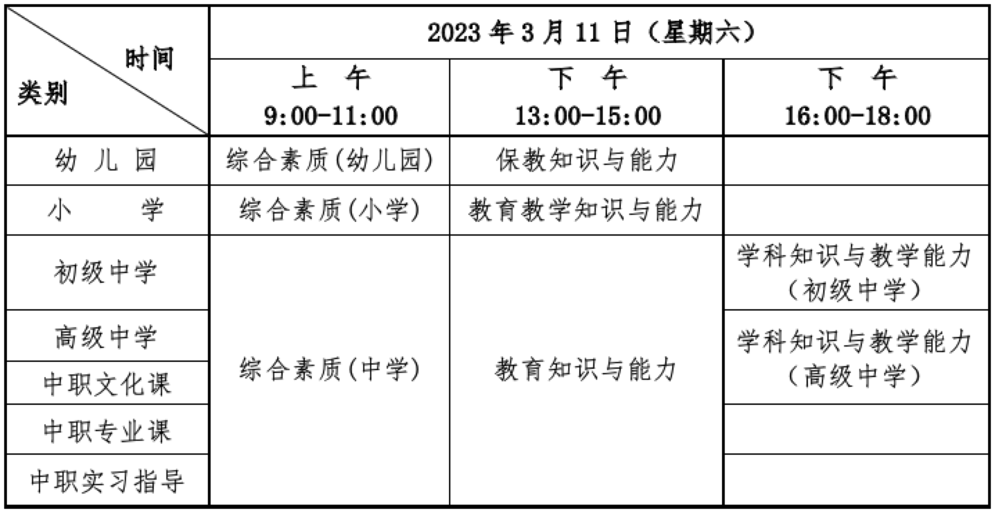 3.选择初中、高中、中职文化课类别中“心理健康教育”、“日语”、“俄语”学科的考生,笔试科目三《学科知识与教学能力》暂不考试,结合面试一并考核;选择小学类别中“心理健康教育”、“信息技术”、“小学全科”的考生,笔试科目为《综合素质》(代码:201)和《教育教学知识与能力》(代码:202)。