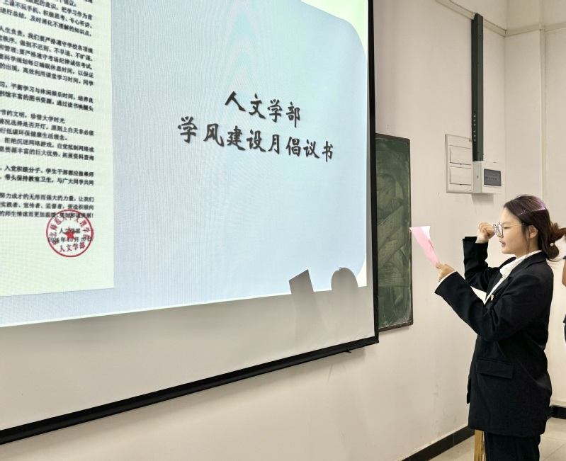 仪式最后,苗盛同学带领大家宣读了《人文学部学风建设月倡议书》,呼吁大家争做优良学风的主导者和参与者。大家纷纷表示,将以实际行动支持学风建设,以积极的态度投入学习,提升自我,共同营造良好的学习氛围。通过这一倡议,师生们在思想上达成共识,增强了对学风建设的责任感与使命感。