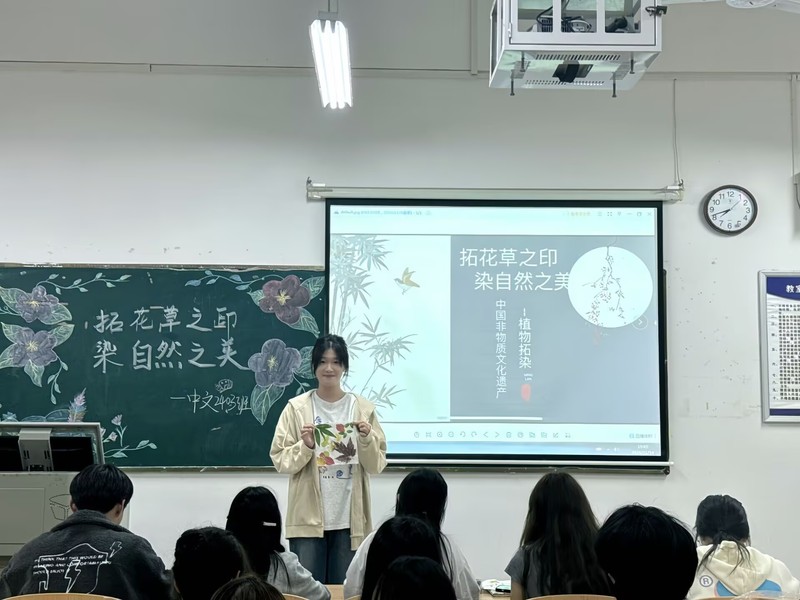 20241114日晚,中文2403班在1A106教室举办了一场别开生面的植物拓染活动,主题为“拓花草之印,染自然之美”。此次活动不仅让同学们亲手体验并传承这一传统染色技艺,也展示了植物拓染艺术的独特魅力。