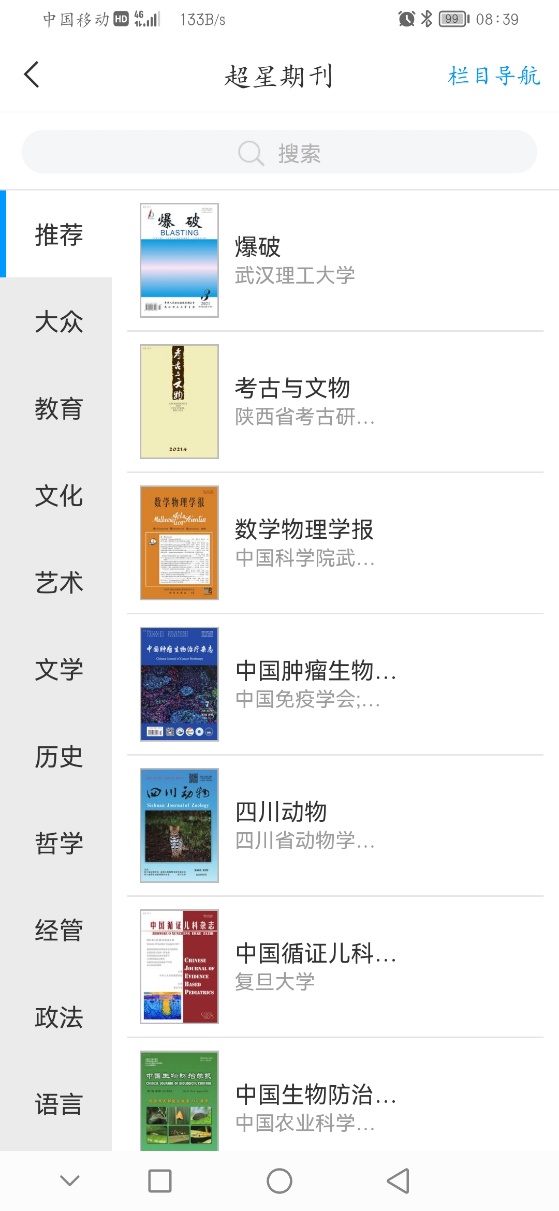超星期刊是与读秀学术搜索对接的期刊检索平台,可以通过分类查找期刊,也可以通过检索期刊名、出版地、关键词找到需要的期刊,期刊内容实时更新。在左下角“本刊导读”里,“刊期导览”可以找到从发行至今的所有期刊文章;“分类导览”可通过作者、学科等分类找到对应的文章;“特色栏目”是本刊的特色;“统计评价”可以看到发文量趋势、年度基金资助文献量、文献所属栏目分布、学科分布;“本刊简介”是对期刊的简单介绍。