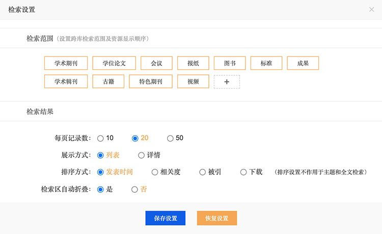 (2)在一框式检索或高级检索页面中的检索设置里删除或添加资源类型