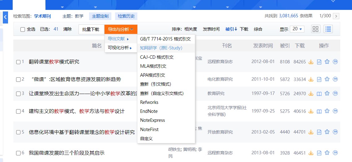总库检索后,点击各资源类型名称,下方的检索结果区即为该资源类型文献。