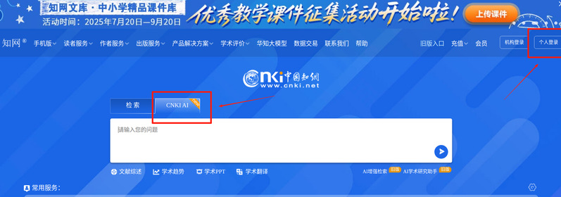 访问方式:登录知网首页www.cnki.net,后切换至CNKI AI进入。右上角机构登录显示“BD半岛bandao·(中国区)官方网站”后,点击右上角“个人登录”,注册/登录个人账号后登录使用。