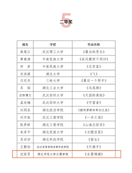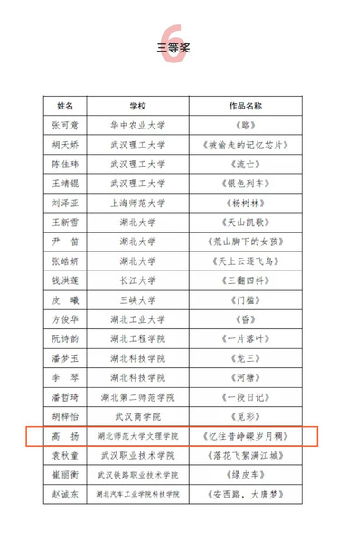 2019年9月湖北省作家协会、湖北省学生联合会联合下发了《关于举办湖北省高校第十八届“福创杯”新青年小说大赛的通知》。大赛自启动以来,我校高度重视、广泛动员,文理学子踊跃报名。其中沈家贤、高扬两人作品打入决赛,榜上有名,展现了BD半岛bandao·(中国区)官方网站学生过硬的综合素质,凸显了BD半岛bandao·(中国区)官方网站文化育人的工作实效。