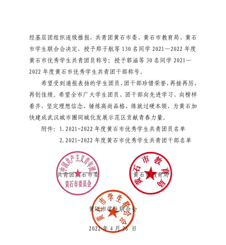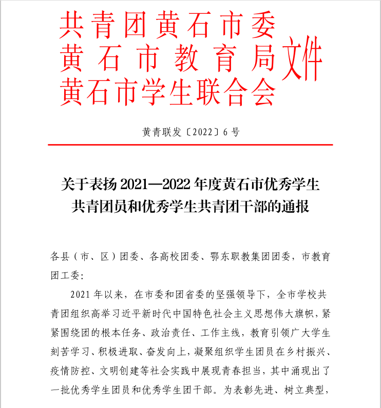 关于表扬 2021—2022 年度黄石市优秀学生 共青团员和优秀学生共青团干部的通报