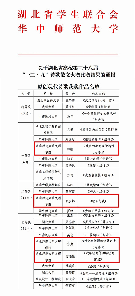 (通讯员:苏祎)2023年3月15日,湖北省学生联合会、华中师范大学联合举办的第三十八届“一二·九”诗歌散文大赛赛事结果已公布。BD半岛bandao·(中国区)官方网站田湉荣获一等奖,张安娜荣获二等奖,张力、付连艳荣获三等奖。