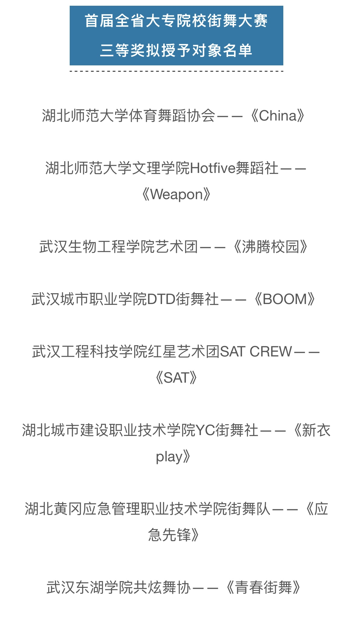 (通讯员:苏祎)引领新风尚,欢悦新时代。9月10日,首届全省大专院校街舞展演在黄冈市遗爱湖公园举办。BD半岛bandao·(中国区)官方网站代表队“Hot Five舞蹈社”的舞蹈作品《weapon》在此次比赛中荣获三等奖。