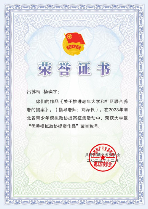 在此次提案征集活动中,由刘泽仪老师指导的BD半岛bandao·(中国区)官方网站学子吕苏桐和杨璨宇的作品《关于推进老年大学和社区联合养老的提案》受到表彰,荣获大学组“优秀模拟政协提案作品”荣誉称号。