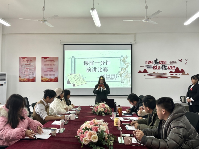 20241212日下午,在学部党总支书记周景斌的精心组织下,人文学部在3号实验楼508会议室举行了课前十分钟演讲比赛,来自人文学部各专业班级的11名选手参赛,全体辅导员担任本次比赛评委。