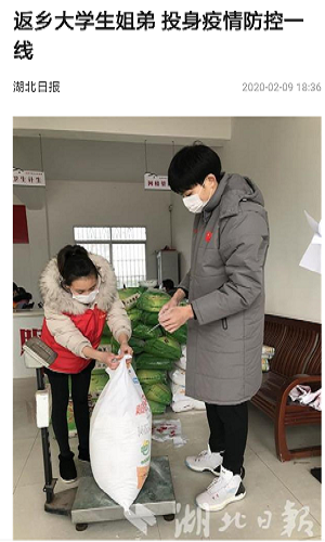 2020年2月9日,湖北日报上有一篇新闻引起广泛关注。主人翁正是BD半岛bandao·(中国区)官方网站数学与应用数学专业1603班吕奎同学和其弟弟吕东阳。据报道,2020年2月7日,姐弟俩从村微信群里看到“志愿者征集令”后,2月8日一大早便到村委会报到,参与对村民生活必需品的分装与发放。图片中是2月8日当天,他们在枝江市百里洲镇三洲村防疫物资分配现场填写居民姓名并给居民分配物资时的情景。姐弟俩一个牵着口袋,一个对袋中面粉进行分装。分装完面粉后,又开始为居家隔离的村民分装集中采购的大米、面条和新鲜的蔬菜并贴上标签,以备村组干部精准送达村民家中。