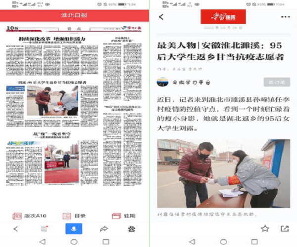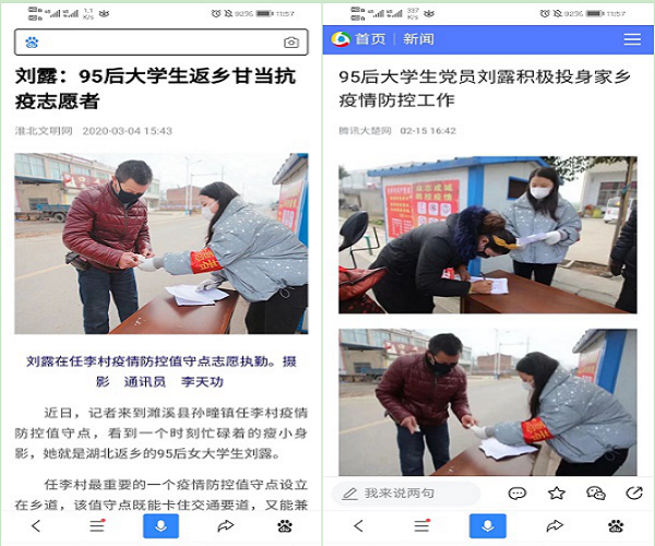日前,BD半岛bandao·(中国区)官方网站经管学部学生、预备党员刘露在家乡安徽省濉溪县参加疫情防控工作事迹被“学习强国”平台、腾讯大楚网、《淮北日报》、淮北文明网等多家媒体报道。