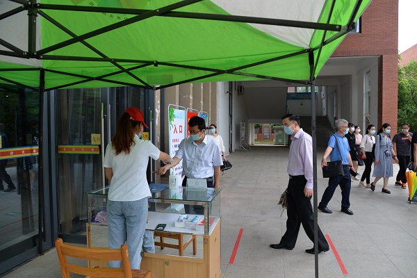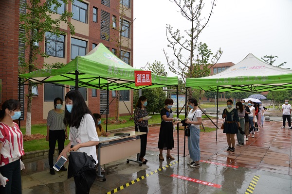 实战演练阶段以“学生”入校为起点,分别以进入校园、办理毕业手续、入住学生宿舍、食堂就餐等为模拟场景,演练了不同场所的健康检测、秩序维持、进出路径、必要流程及突发情况应急处置等环节。