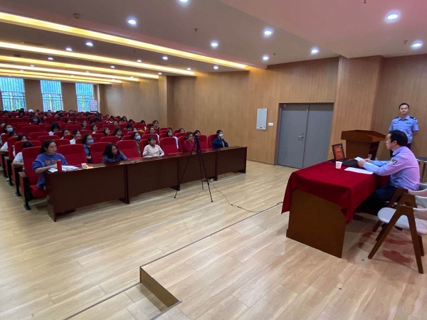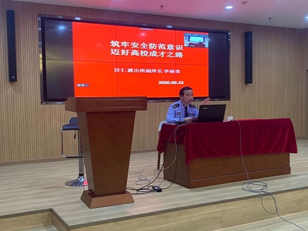 9月23日下午,汪仁镇派出所副所长李福奎一行3人来到BD半岛bandao·(中国区)官方网站,开展法治教育进校园活动。活动采取网络授课的形式进行,在信息中心报告厅设主会场,在各学部教室设分会场,2020级1300余名本科新生参加了听课。