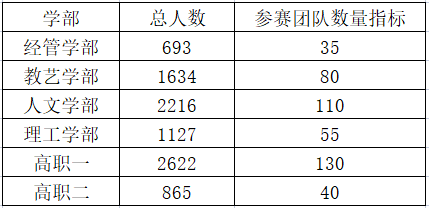 各学部报送申报大学生创新创业训练计划的项目,符合本次大赛参赛时效等规定的,须全部参加本次大赛,项目计划书须按“互联网+”大赛的格式和内容要求进行修改调整,并根据项目负责人的归属确定参赛项目所代表的学部。参赛团队数量指标分配:根据《湖北赛区组委会通知 (第1号)》文中“各本科高校和高职院校参加大赛的学生人数应不低于全日制在校生数的15%,网上申报大赛的项目数应不低于全日制在校生数5%(即每100名学生应推荐5项)”的具体要求,结合目前各学部在校生人数,分配参赛团队数量指标如下: