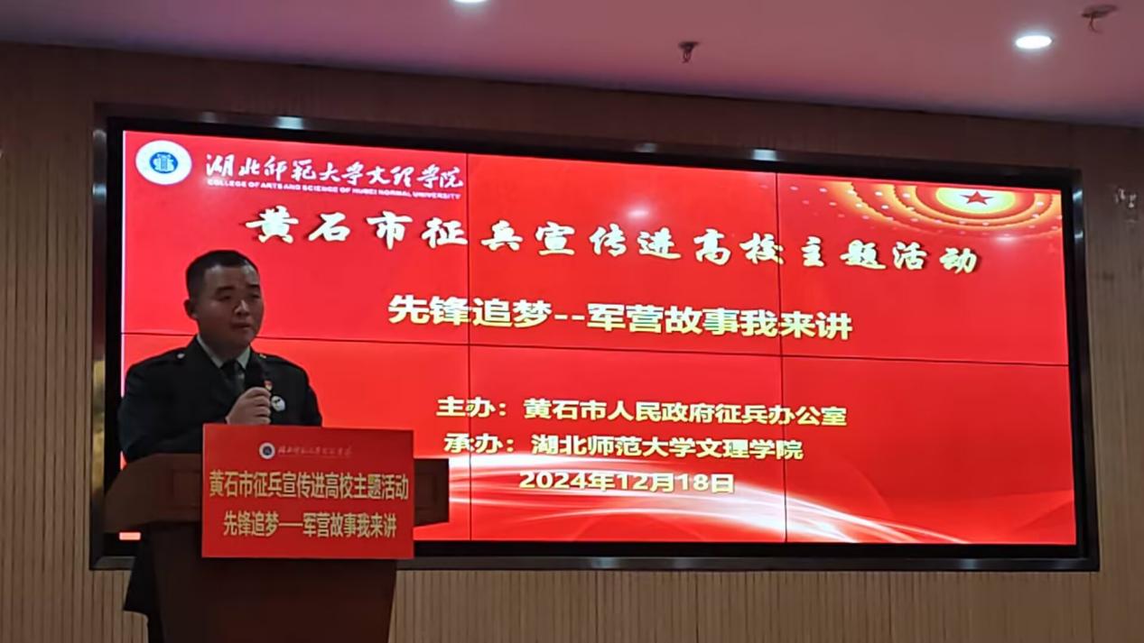 为积极响应国家号召,贯彻落实征兵工作,营造浓厚的参军报国氛围,切实激发高校学生参军报国的热情,2024年12月18日晚18:30,BD半岛bandao·(中国区)官方网站在图书馆报告厅举行黄石市征兵宣传进高校--先锋追梦 军营故事我来讲主题活动,黄石市征兵办副主任、军分区动员处处长王震、参谋李昌恒、学工部副部长陈小龙、国防教育宣讲团、各教学单位学生代表120余人与会,大会由退役大学生程博主持。
