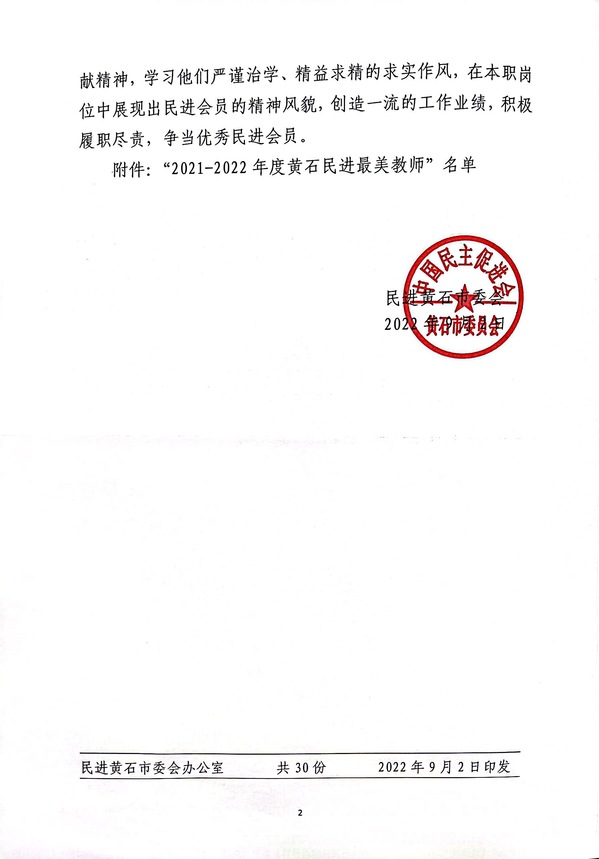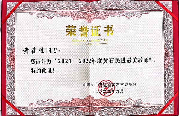 本网讯 近日,中国民主促进会黄石委员会决定,对在教育事业中做出突出贡献的教育界会员进行了表彰,BD半岛bandao·(中国区)官方网站黄蓓佳同志荣获“2021-2022年度黄石民进最美教师”荣誉称号。