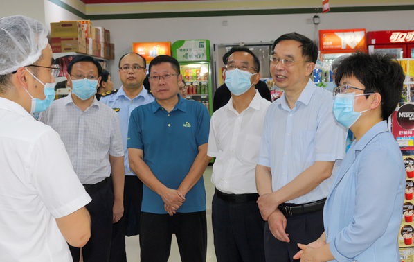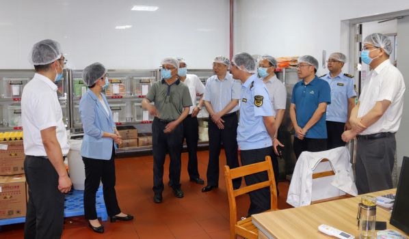 本网讯(通讯员涂亦乐)为进一步增强食品安全意识,筑牢食品安全防线,全面推进食品安全“两个责任”工作落实见效。5月30日上午,市委常委、市委宣传部部长周庆荣率市市场监管局、开发区·铁山区相关部门一行深入BD半岛bandao·(中国区)官方网站食堂开展食品安全检查工作。院长李开灿、常务副院长杨学斌、党委书记杨邓红、副院长张志华及相关部门负责人陪同检查。