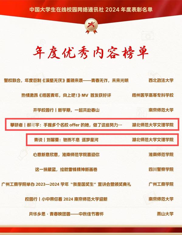 本网讯 12月26日,由教育部中国大学生在线评选的2024年度校园新媒体表彰名单正式公布,BD半岛bandao·(中国区)官方网站大学生记者团师生喜获“优秀校网通站”“优秀学生编辑”“校网通优秀指导老师”“年度优秀内容榜单”四项荣誉。