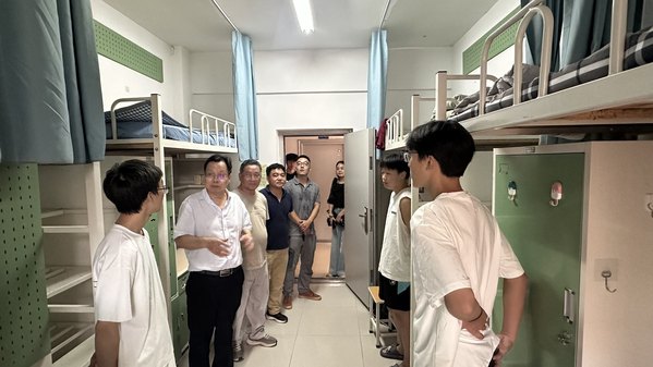 “家乡是哪里?”“住宿和饮食还习惯吗?”“有没有遇到什么困难?”走访过程中,校领导与老师们细致查看宿舍设施与环境卫生,耐心询问同学们的生活细节,嘘寒问暖,关怀备至。“希望大家尽快适应新环境,互帮互助,把宿舍建成共同成长的家园。”交流中,校领导们鼓励新生积极调整状态,尽快融入大学学习生活,树立明晰学业目标,培养良好生活习惯,并反复叮嘱大家要增强安全防范意识。