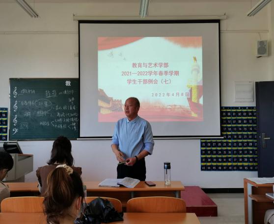 2022年4月8日中午12:00,教育与艺术学部按照惯例在实验楼1-403多媒体教室组织召开学生干部工作例会。辅导员老师、团学会干部及各专业班级班长参加。会议由党总支书记李先华主持。