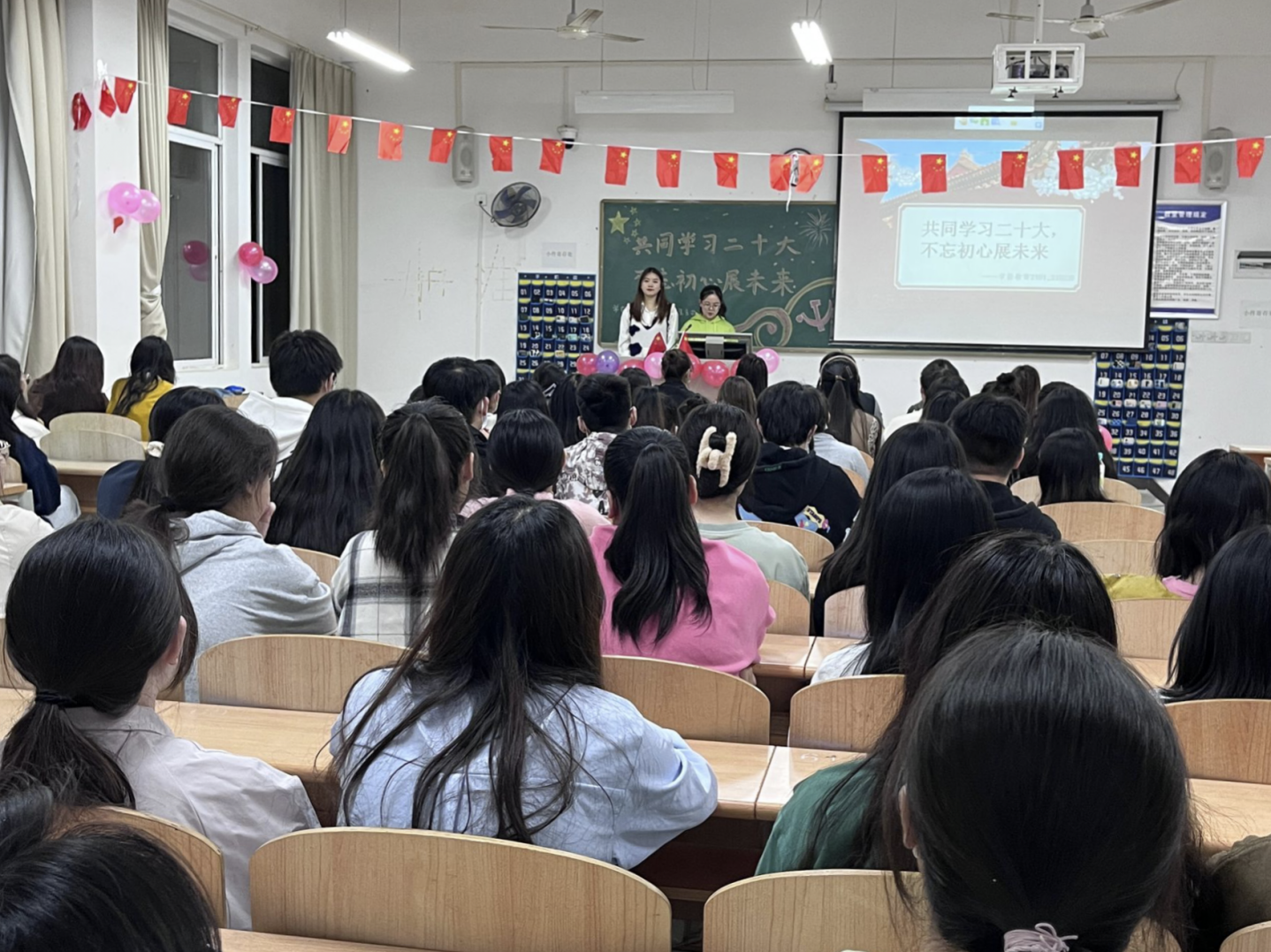 为更好地学习和领会二十大精神,使广大青年学生深刻领悟党的十九大以来取得的重大成果,坚决拥护中国共产党的领导,对新时代中国特色社会主义伟大胜利充满信心。学习好、宣传好、贯彻好党的二十大精神,更好地履行党赋予的职责使命,团结带领广大青年学生成长,担当民族复兴大任的时代新人。根据院团委工作安排,2022年10月23-24日19:00,教育与艺术学部21级与22级学生在多媒体教室分别举办了主题为“共同学习二十大,不忘初心展未来”团日活动。