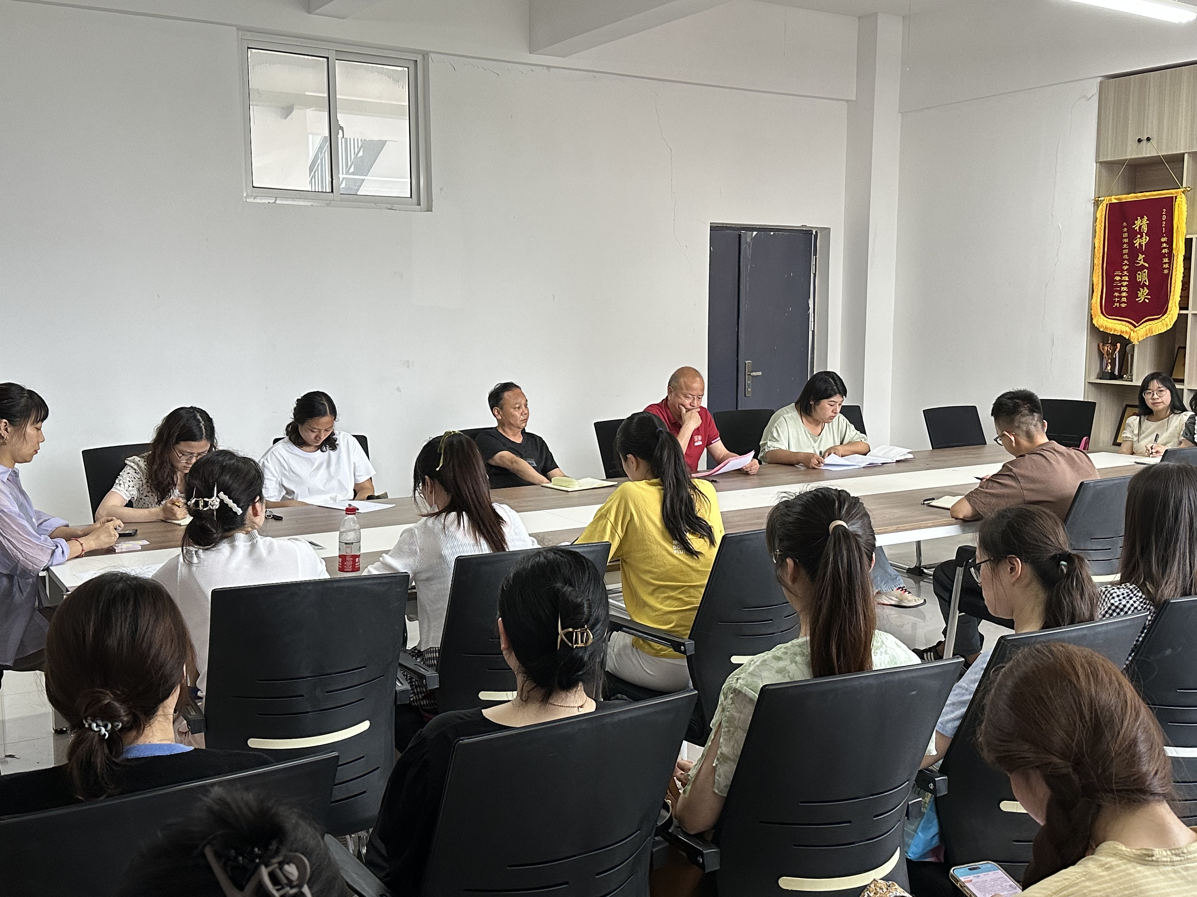 2023年6月14日中午12:00,教育与艺术学部在1号实验楼414会议室召开了学部全体教职工期末工作会议。会议有三项议程:1.胡蕾老师领学中共中央相关文件精神;2.李先华书记重点强调学部在就业、学生安全、期末考试、毕业生相关等方面的工作;3.王文主任做最后总结,并对期末重点工作进行安排部署。
