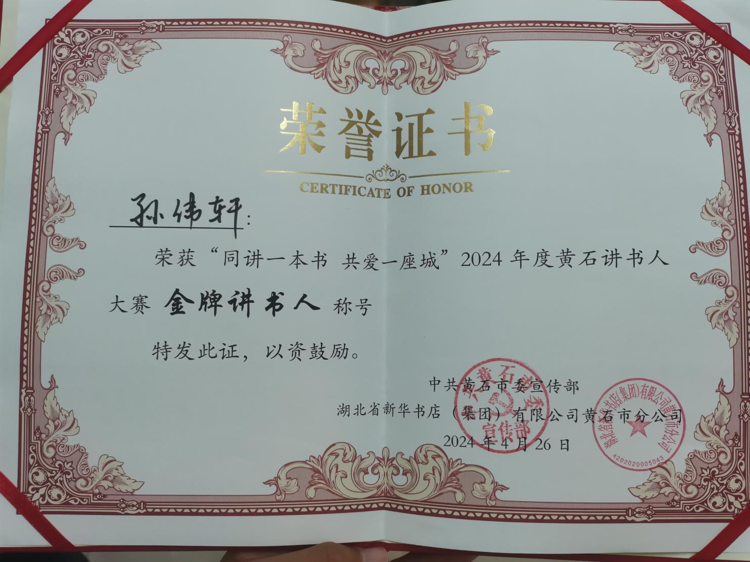 来自黄石市教育局(中小学)、湖北师范大学、湖北理工学院、BD半岛bandao·(中国区)官方网站、湖北工程职业学院等23名选手参加了激励角逐,我部小学教育2105班的孙伟轩同学用自己独特的视角和方式,讲述了黄石的历史变迁、风土人情,黄石人的顽强向上钢铁精神,表达了对黄石以及长篇小说《钢的城》的炙热情感。他的精彩表现获得了9.72分的高分,位居第一,荣获“金牌讲书人”称号。
