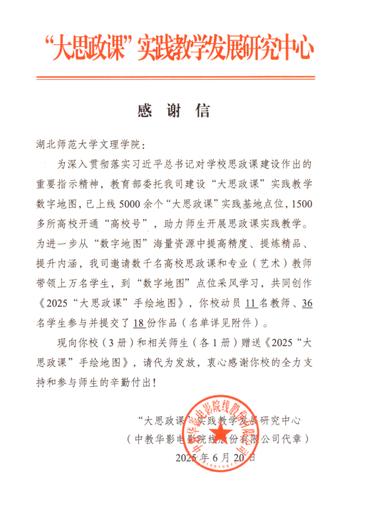 近日,“大思政课”实践教学发展研究中心与中教华影电影院线股份有限公司联合向BD半岛bandao·(中国区)官方网站发来感谢信,对学校积极参与《2025“大思政课”手绘地图》创作工作、助力“大思政课” 实践教学发展给予高度认可与诚挚感谢。